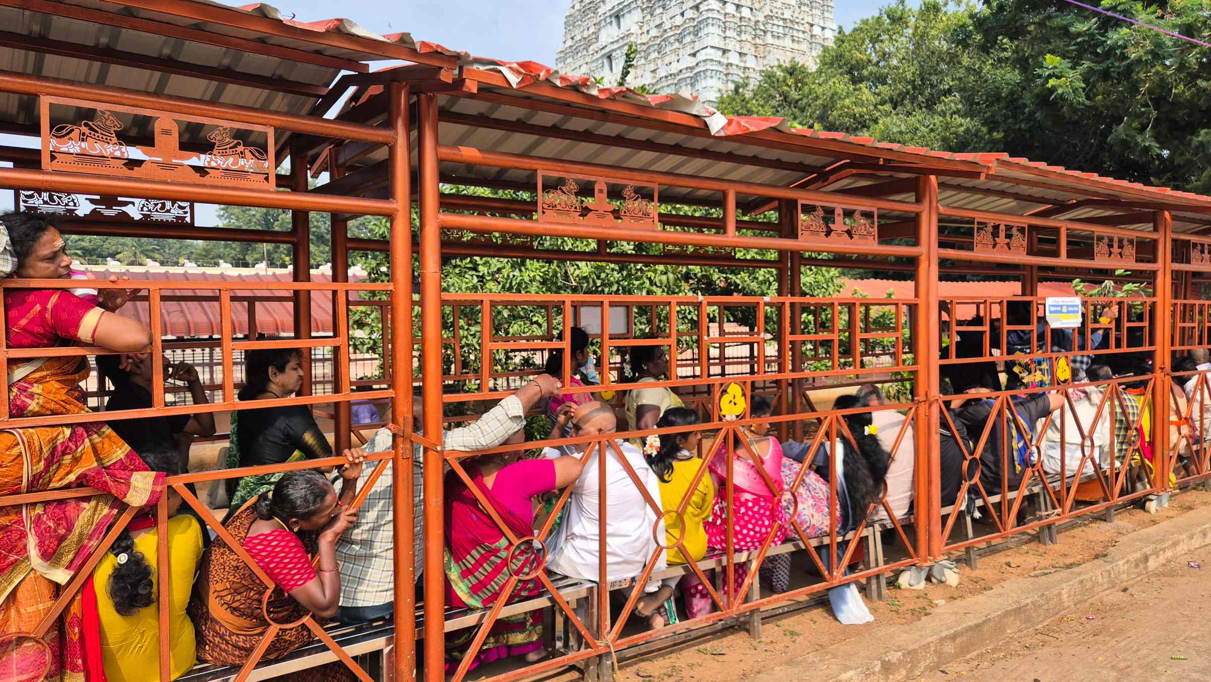 Diese Tempelanlage, die dem Gott Shiva geweiht ist, umfasst ein riesengroßes, ummauertes Areal mit vier Einlasstürmen in jeder Himmelsrichtung. Der erste Eingangsversuch wird mir verwehrt – ich muss meine Fußbekleidung (Trekkingsandalen) draußen lassen. Nein, in meinen Rucksack stecken darf ich sie nicht, ich muss sie draußen lassen! Bei einer der Obst- und Blumenverkäuferinnen neben dem Eingangsportal lasse ich sie gegen eine kleine Gebühr zurück. Barfuß unternehme ich nun den zweiten Zutrittsversuch. Nun wird mein Rucksack ausgiebig kontrolliert. Als man meine Kamera heraus holt, folgt die Ansage, dass in den Innenräumen der Tempel das Fotografieren (auch das Benutzen von Smartphones) strengstens verboten ist. Als ich nickend zustimme, darf ich auf das Gelände. Da es nun Ausschilderungen nur noch auf Tamil gibt, folge ich dem Hauptstrom der Gäste in einen vielleicht zwei Meter breiten, zu beiden Seiten vergitterten Gang. Bereits nach wenigen Schritten ist dann das Stauende in diesem Gang erreicht und es geht für die nächsten rund zwei Stunden nur noch im lähmenden Stopp and Go – Tempo voran. Unser Gittergang führt uns an verschiedenen Bauwerken außen vorbei. Wir haben Blick auf das riesige Innenareal, auf dem sich einige wenige BesucherInnen bewegen oder auch im Schatten von Bäumen ausruhen. Schließlich führt uns unser Gang auf den Haupttempel zu. Ich merke das daran, dass plötzlich noch weitere Gittergänge (vermutlich von den anderen Eingängen her führend) parallel zu unserem geführt werden und daran, dass die Menschen in meiner Schlange unruhig werden, versuchen vorzudrängeln, die Hälse recken, um vorab einen Blick auf das Heiligtum erhaschen zu können. Im Haupttempel herrscht eine sehr eigenartige Atmosphäre. Es ist fast Dunkel. An einigen Stellen jedoch wird unter Scheinwerfer- und Maschineneinsatz gearbeitet. Endlich führen drei Gänge nebeneinander auf das Hauptheiligtum zu. Es geht ein wenig treppauf, die Gänge verjüngen sich, sodass aus allen drei Gängen die Menschen nun einzeln heraustreten – angewiesen und zeitweise gestoppt von zahlreichen Ordnungskräften in (Polizei-?)Uniform. Die meisten Gläubigen sind nun total aufgeregt, recken ihre Arme nach oben, murmeln Gebete. Sie lassen sich farbige Male auf die Stirn streifen, ich bekomme zumindest ein weißes Pulver in die offene Hand gegeben. Einige Gläubige nehmen es in den Mund, andere schmieren es auf bestimmte Steinfiguren an der Wand. Ich zerreibe es mit den Handflächen, weil ich nicht weiß, was ich damit machen soll. Das winzig kleine Abbild der Gottheit, vor der die Menschen wie verzückt innehalten und Demutsgesten ausführen, ist bestimmt noch 20 Meter entfernt, als ich eine Möglichkeit finde, die Spur zu wechseln und den Rücktritt anzutreten. Der way to exit ist nun auch für mich ausgewiesen, die Zeit der Käfighaltung ist vorbei. Auf dem offenen Gelände vor dem Tempel stehen oder sitzen viele Gläubige in Gruppen zusammen und bedienen sich an den Trinkwasserstellen.
