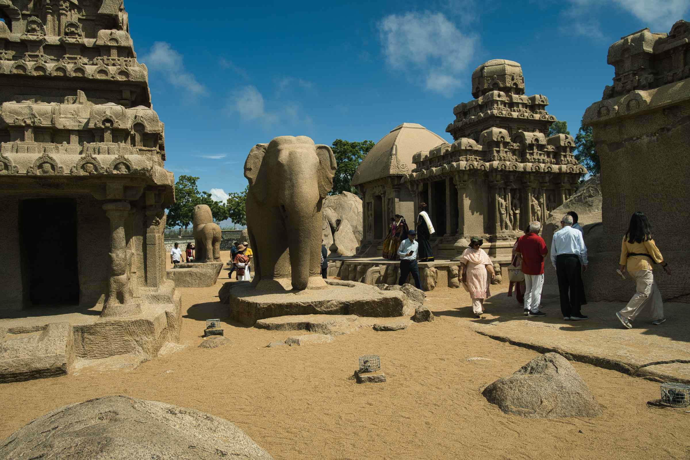 Die Straßen jedoch, die vom Verkehrszentrum der Stadt auf diese stehengebliebene Welt zuführen, sind allesamt geprägt von einer Abfolge von Hotels, Guesthouses, Souvenirshops, Restaurants, Cafés, Bars, Massageshops, … – so weit, so gut oder schlecht. Natürlich verstehe ich, dass die hier lebenden Menschen Geld mit dem Tourismus verdienen wollen. Aber das Verhältnis zwischen Angebot und Nachfrage scheint nicht (mehr?) ausgeglichen. An den touristischen Hotspots (Butterball, Shore Temple, Lighthouse, Five Rathas, …) werden busladungsweise massenhaft Touristen organisierter Rundreisen ausgespuckt – aber auch wieder aufgesammelt, denn es sind Tagestouristen, von denen die wenigsten Gruppen auch die Nacht im Ort verbringen.