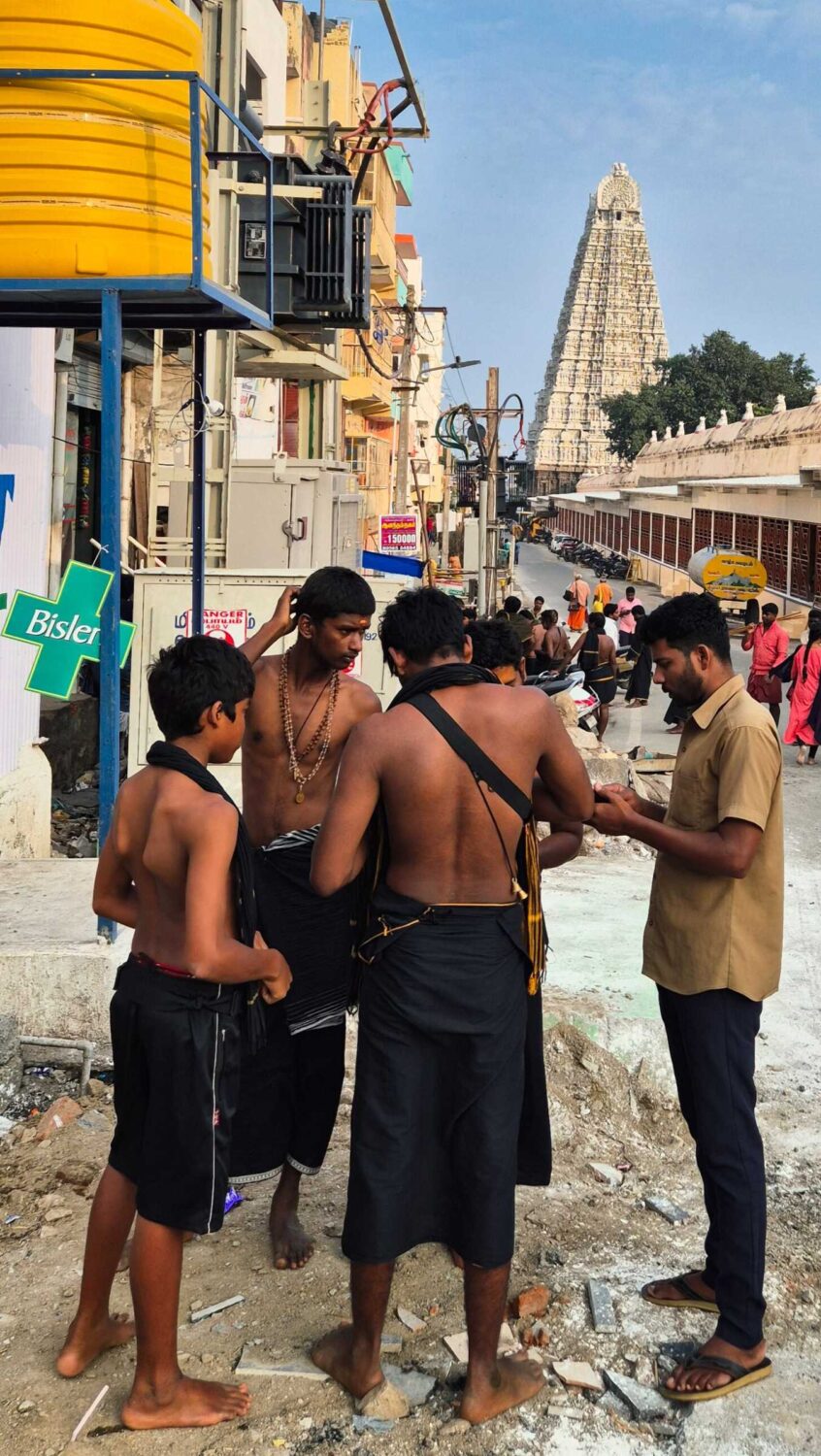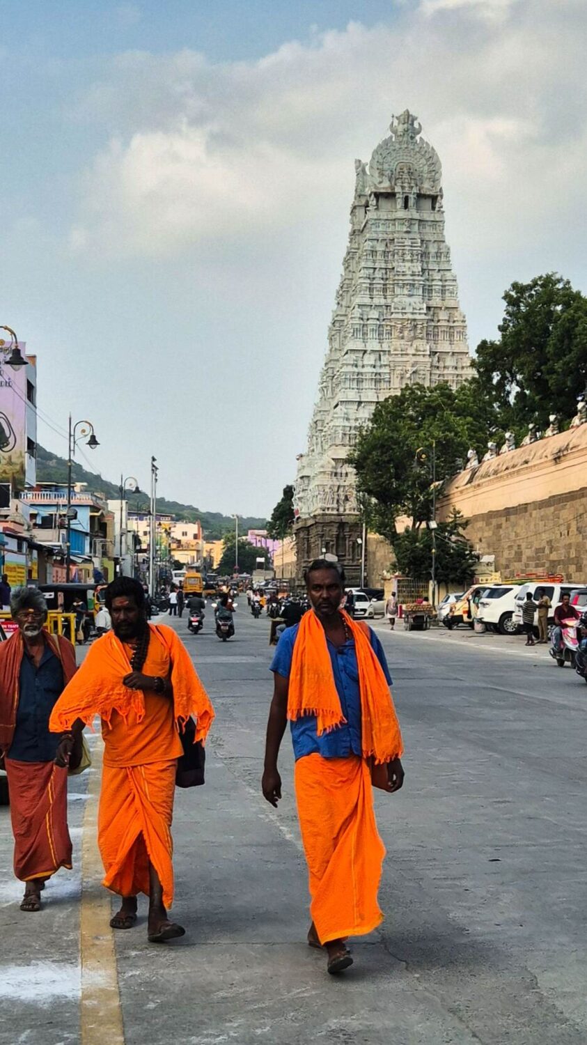 „Tiruvannamalai ist einer der meistbesuchten hinduistischen Wallfahrtsorte in Tamil Nadu… Das Wahrzeichen Tiruvannamalais ist der gewaltige Arunachaleswara-Tempel. Um das zentrale Heiligtum der Tempelanlage – mit einer Ausdehnung von knapp zehn Hektar einer der größten Südindiens – sind drei Innenhöfe angeordnet, die jeweils durch kunstvoll verzierte Gopurams (Tortürme) betreten werden….“ (Wikipedia)