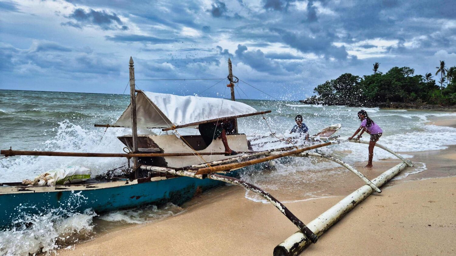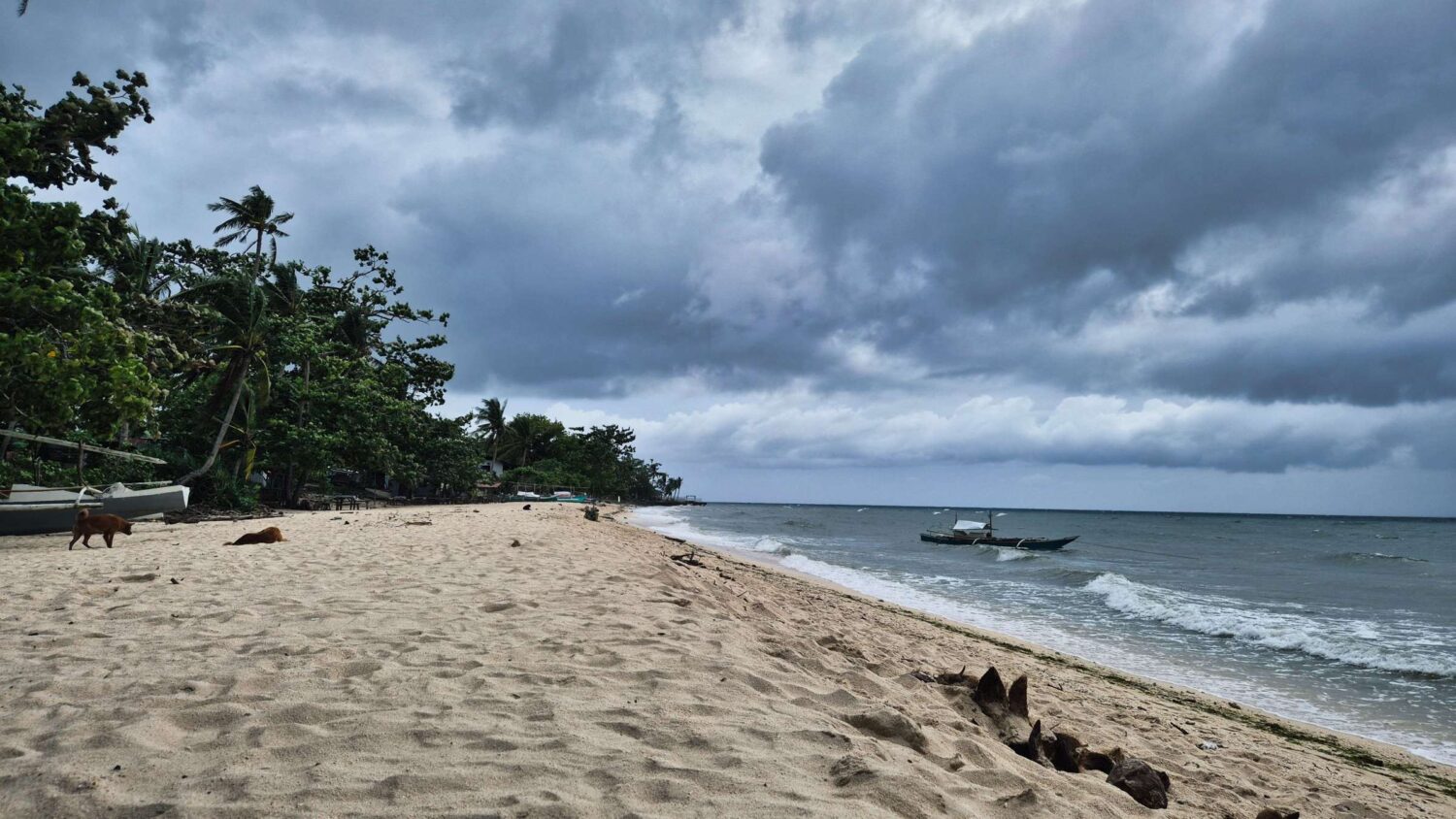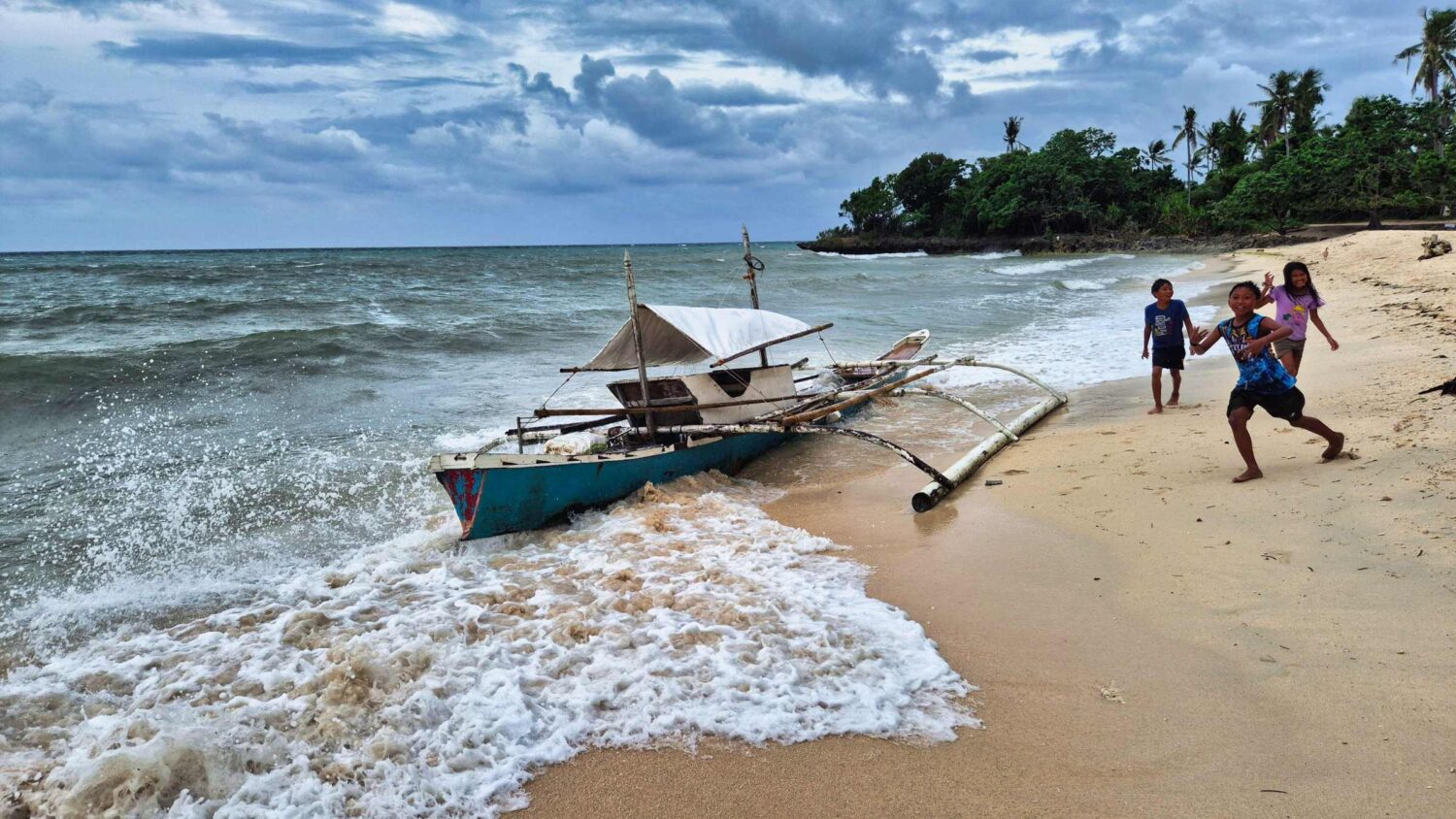 Der kurze Sprung ins Wasser wird vertagt. Ein mächtiger Sturm, der später auch Regen und – den hier üblichen – Stromausfall mit sich bringt, vertreibt uns bald. Aber die Kinder haben ihren Spaß beim Entern des angespülten Fischerbootes.