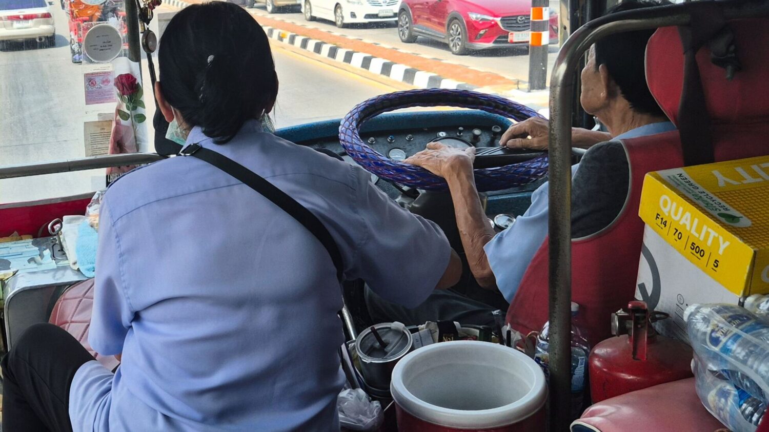 Noch vor einem Jahr fuhren Busse und Vans im Stundentakt vom Busbahnhof Suphan Buri nach Kanchanaburi – heute sind es drei über den Tag verteilt. Die zunehmende Motorisierung breiter Bevölkerungsschichten hat zumindest auf dem Land zum Zusammenbruch des öffentlichen Transportsystems geführt. Einige Linien sind ganz eingestellt, die meisten auf ein Minimum zusammen gestrichen.