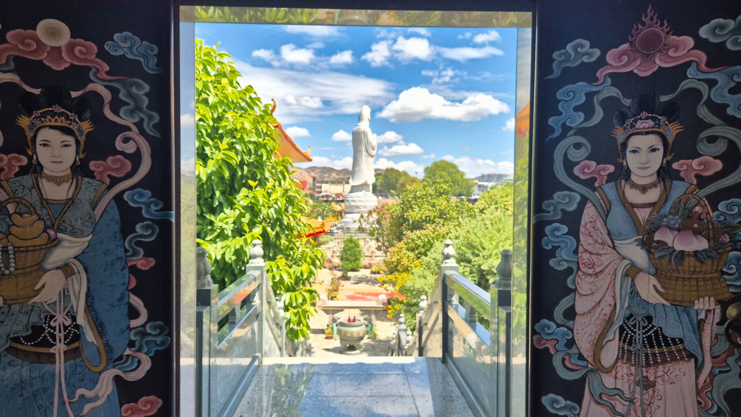 folge dem Zug über die Brücke und besuche dann das wihan phra phothisat kuan im, einen eindrucksvollen chinesischen Tempel, der auf der anderen Seite der Brücke liegt, besucht.