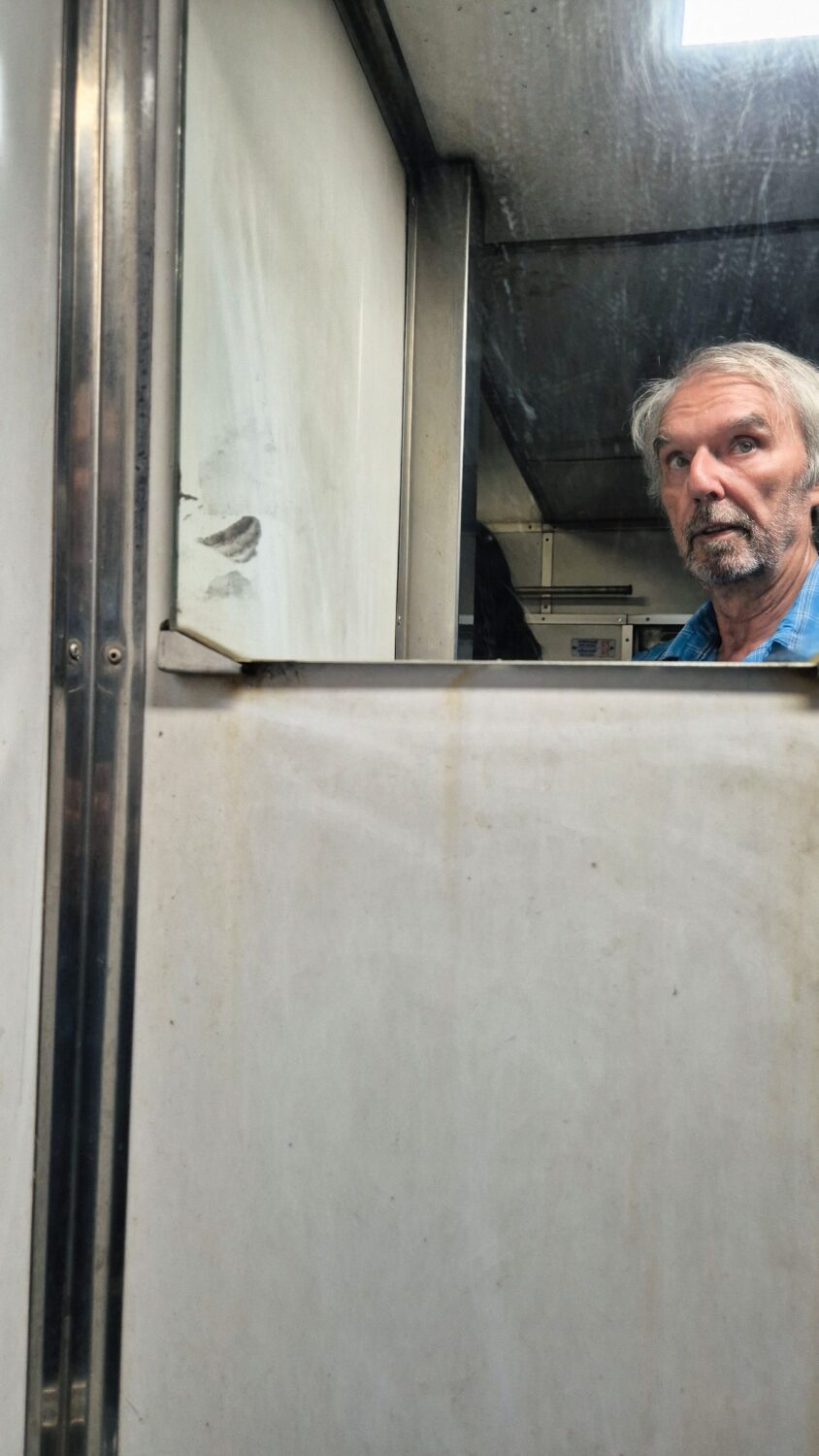 Die Sitzplätze in allen vier Zügen am Vormittag sind ausgebucht, so dass ich mich leicht für einen Stehplatz im nächstmöglichen Zug entscheiden kann. Ich finde ein stressfreies Plätzchen für mich und meine Rucksäcke in der Handwaschecke des Waggons
