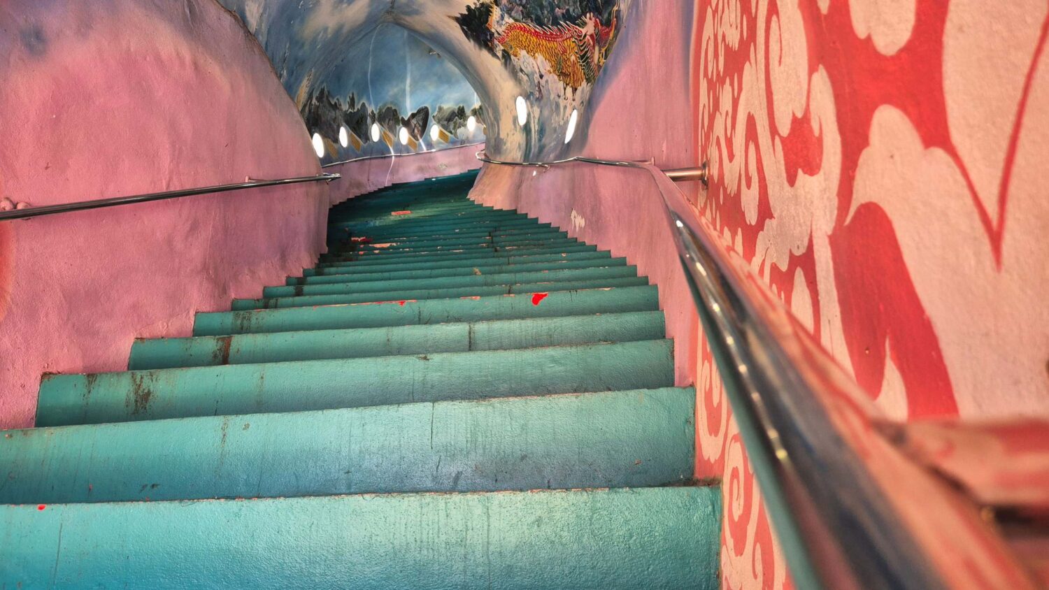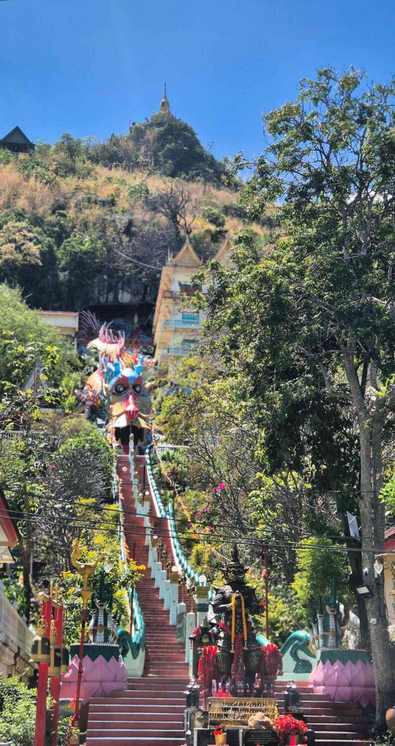Der Aufstieg zum Wat Ban Tham ist tierisch anstregend. Im unteren Teil noch easy, weil man im Schatten des Nagakörpers auf genormten Stufen geht, die oberen zwei Drittel jedoch sind richtig steil. Auf einer senkrecht nach oben führenden Wendeltreppe durchsteigt man eine Riesenhöhle und das oberste Drittel bringt man durch Kraxeln über Naturfelsen hinter sich. Nix für alte Leute!