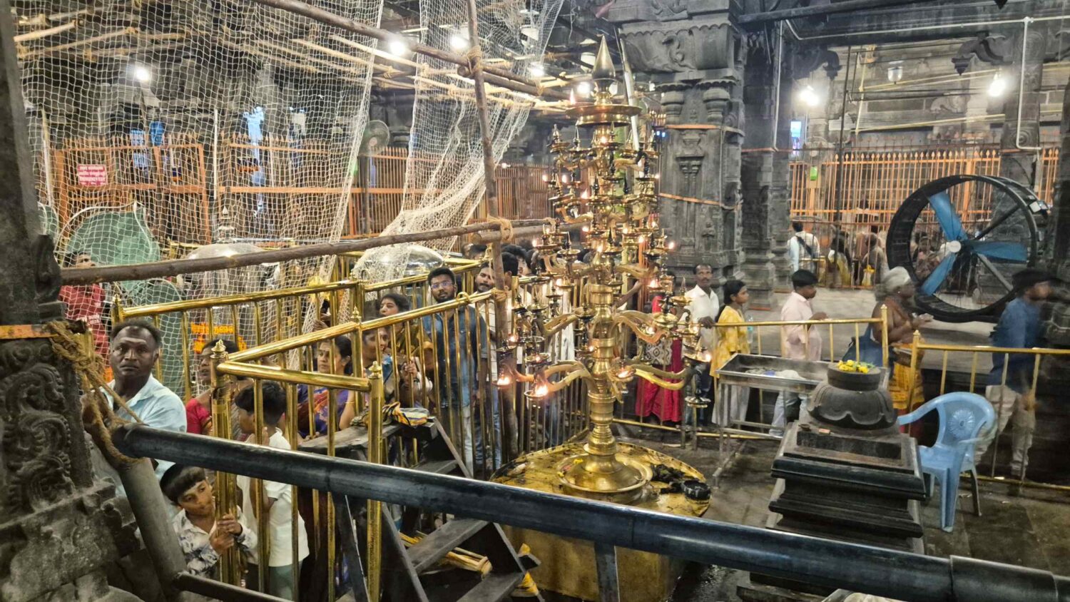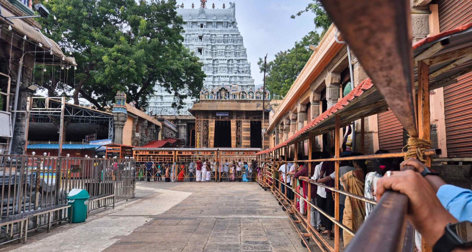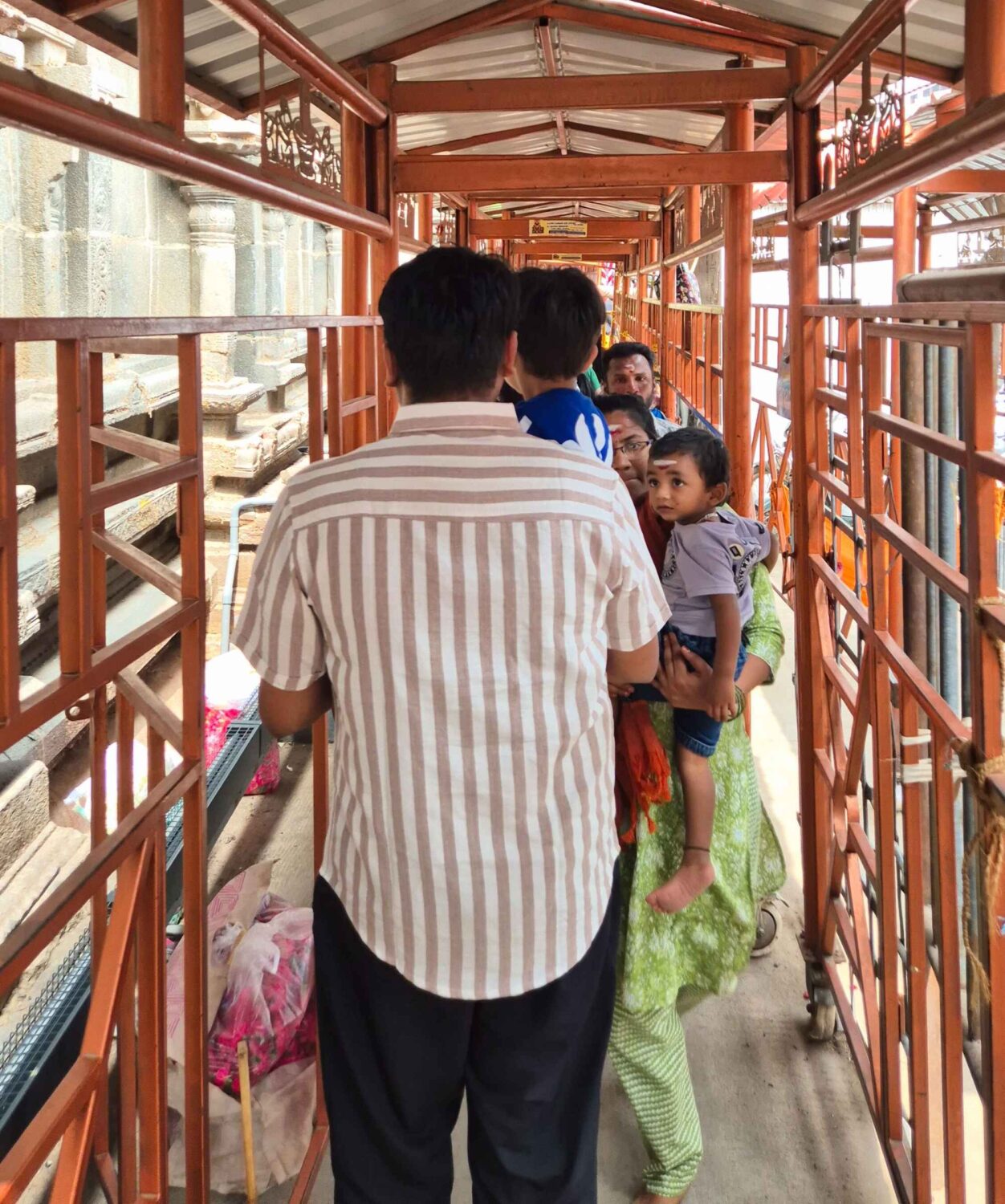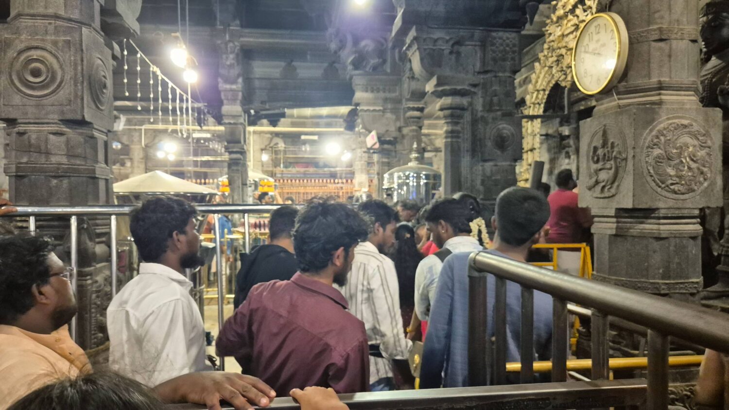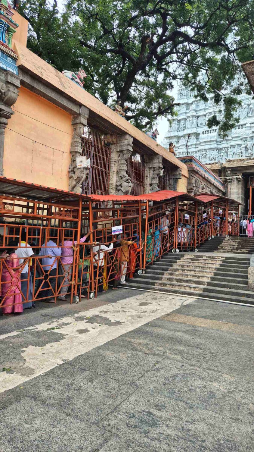 Diese Tempelanlage, die dem Gott Shiva geweiht ist, umfasst ein riesengroßes, ummauertes Areal mit vier Einlasstürmen in jeder Himmelsrichtung. Der erste Eingangsversuch wird mir verwehrt – ich muss meine Fußbekleidung (Trekkingsandalen) draußen lassen. Nein, in meinen Rucksack stecken darf ich sie nicht, ich muss sie draußen lassen! Bei einer der Obst- und Blumenverkäuferinnen neben dem Eingangsportal lasse ich sie gegen eine kleine Gebühr zurück. Barfuß unternehme ich nun den zweiten Zutrittsversuch. Nun wird mein Rucksack ausgiebig kontrolliert. Als man meine Kamera heraus holt, folgt die Ansage, dass in den Innenräumen der Tempel das Fotografieren (auch das Benutzen von Smartphones) strengstens verboten ist. Als ich nickend zustimme, darf ich auf das Gelände. Da es nun Ausschilderungen nur noch auf Tamil gibt, folge ich dem Hauptstrom der Gäste in einen vielleicht zwei Meter breiten, zu beiden Seiten vergitterten Gang. Bereits nach wenigen Schritten ist dann das Stauende in diesem Gang erreicht und es geht für die nächsten rund zwei Stunden nur noch im lähmenden Stopp and Go – Tempo voran. Unser Gittergang führt uns an verschiedenen Bauwerken außen vorbei. Wir haben Blick auf das riesige Innenareal, auf dem sich einige wenige BesucherInnen bewegen oder auch im Schatten von Bäumen ausruhen. Schließlich führt uns unser Gang auf den Haupttempel zu. Ich merke das daran, dass plötzlich noch weitere Gittergänge (vermutlich von den anderen Eingängen her führend) parallel zu unserem geführt werden und daran, dass die Menschen in meiner Schlange unruhig werden, versuchen vorzudrängeln, die Hälse recken, um vorab einen Blick auf das Heiligtum erhaschen zu können. Im Haupttempel herrscht eine sehr eigenartige Atmosphäre. Es ist fast Dunkel. An einigen Stellen jedoch wird unter Scheinwerfer- und Maschineneinsatz gearbeitet. Endlich führen drei Gänge nebeneinander auf das Hauptheiligtum zu. Es geht ein wenig treppauf, die Gänge verjüngen sich, sodass aus allen drei Gängen die Menschen nun einzeln heraustreten – angewiesen und zeitweise gestoppt von zahlreichen Ordnungskräften in (Polizei-?)Uniform. Die meisten Gläubigen sind nun total aufgeregt, recken ihre Arme nach oben, murmeln Gebete. Sie lassen sich farbige Male auf die Stirn streifen, ich bekomme zumindest ein weißes Pulver in die offene Hand gegeben. Einige Gläubige nehmen es in den Mund, andere schmieren es auf bestimmte Steinfiguren an der Wand. Ich zerreibe es mit den Handflächen, weil ich nicht weiß, was ich damit machen soll. Das winzig kleine Abbild der Gottheit, vor der die Menschen wie verzückt innehalten und Demutsgesten ausführen, ist bestimmt noch 20 Meter entfernt, als ich eine Möglichkeit finde, die Spur zu wechseln und den Rücktritt anzutreten. Der way to exit ist nun auch für mich ausgewiesen, die Zeit der Käfighaltung ist vorbei. Auf dem offenen Gelände vor dem Tempel stehen oder sitzen viele Gläubige in Gruppen zusammen und bedienen sich an den Trinkwasserstellen.