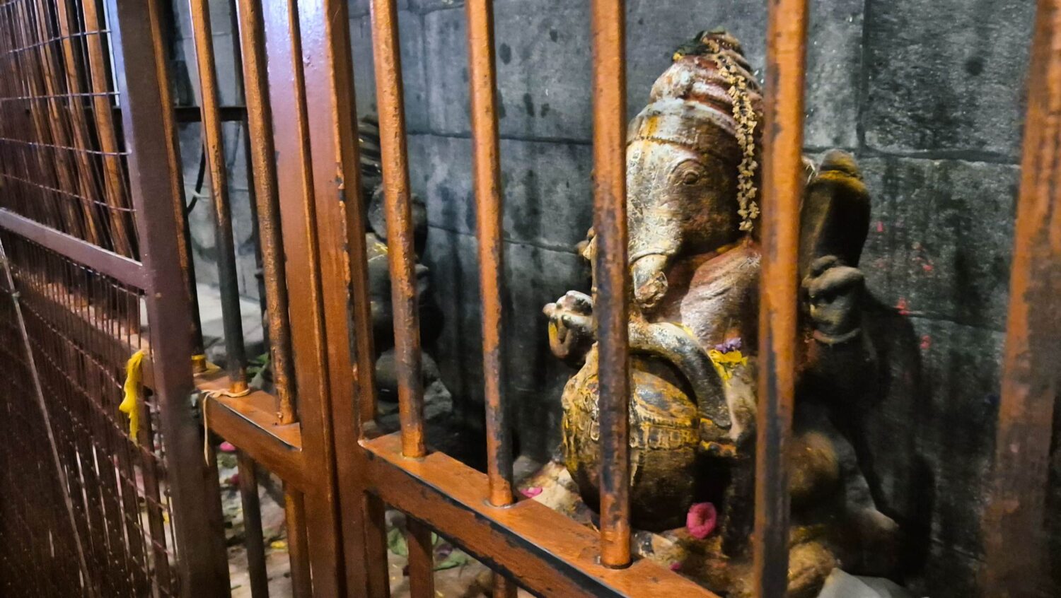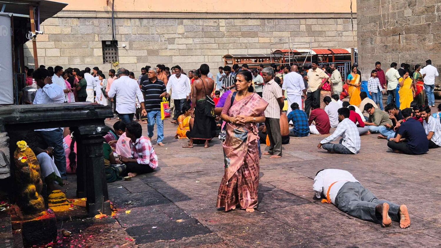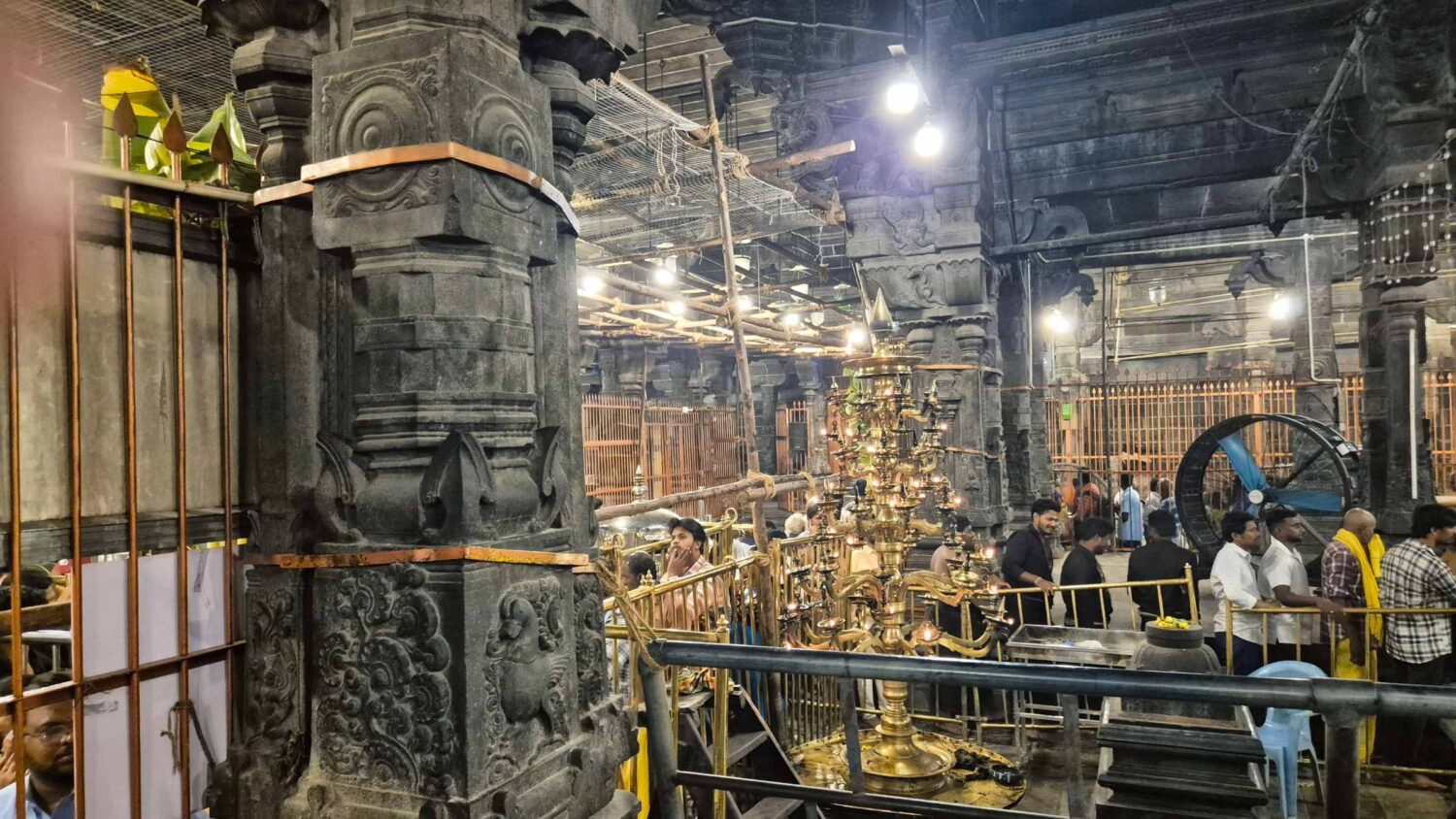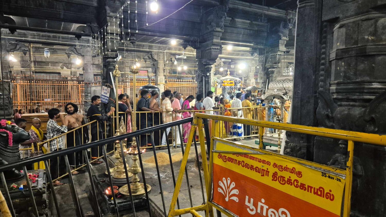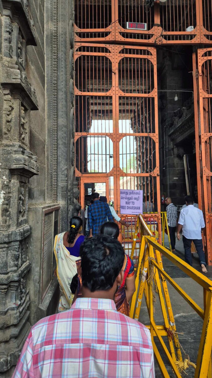 Diese Tempelanlage, die dem Gott Shiva geweiht ist, umfasst ein riesengroßes, ummauertes Areal mit vier Einlasstürmen in jeder Himmelsrichtung. Der erste Eingangsversuch wird mir verwehrt – ich muss meine Fußbekleidung (Trekkingsandalen) draußen lassen. Nein, in meinen Rucksack stecken darf ich sie nicht, ich muss sie draußen lassen! Bei einer der Obst- und Blumenverkäuferinnen neben dem Eingangsportal lasse ich sie gegen eine kleine Gebühr zurück. Barfuß unternehme ich nun den zweiten Zutrittsversuch. Nun wird mein Rucksack ausgiebig kontrolliert. Als man meine Kamera heraus holt, folgt die Ansage, dass in den Innenräumen der Tempel das Fotografieren (auch das Benutzen von Smartphones) strengstens verboten ist. Als ich nickend zustimme, darf ich auf das Gelände. Da es nun Ausschilderungen nur noch auf Tamil gibt, folge ich dem Hauptstrom der Gäste in einen vielleicht zwei Meter breiten, zu beiden Seiten vergitterten Gang. Bereits nach wenigen Schritten ist dann das Stauende in diesem Gang erreicht und es geht für die nächsten rund zwei Stunden nur noch im lähmenden Stopp and Go – Tempo voran. Unser Gittergang führt uns an verschiedenen Bauwerken außen vorbei. Wir haben Blick auf das riesige Innenareal, auf dem sich einige wenige BesucherInnen bewegen oder auch im Schatten von Bäumen ausruhen. Schließlich führt uns unser Gang auf den Haupttempel zu. Ich merke das daran, dass plötzlich noch weitere Gittergänge (vermutlich von den anderen Eingängen her führend) parallel zu unserem geführt werden und daran, dass die Menschen in meiner Schlange unruhig werden, versuchen vorzudrängeln, die Hälse recken, um vorab einen Blick auf das Heiligtum erhaschen zu können. Im Haupttempel herrscht eine sehr eigenartige Atmosphäre. Es ist fast Dunkel. An einigen Stellen jedoch wird unter Scheinwerfer- und Maschineneinsatz gearbeitet. Endlich führen drei Gänge nebeneinander auf das Hauptheiligtum zu. Es geht ein wenig treppauf, die Gänge verjüngen sich, sodass aus allen drei Gängen die Menschen nun einzeln heraustreten – angewiesen und zeitweise gestoppt von zahlreichen Ordnungskräften in (Polizei-?)Uniform. Die meisten Gläubigen sind nun total aufgeregt, recken ihre Arme nach oben, murmeln Gebete. Sie lassen sich farbige Male auf die Stirn streifen, ich bekomme zumindest ein weißes Pulver in die offene Hand gegeben. Einige Gläubige nehmen es in den Mund, andere schmieren es auf bestimmte Steinfiguren an der Wand. Ich zerreibe es mit den Handflächen, weil ich nicht weiß, was ich damit machen soll. Das winzig kleine Abbild der Gottheit, vor der die Menschen wie verzückt innehalten und Demutsgesten ausführen, ist bestimmt noch 20 Meter entfernt, als ich eine Möglichkeit finde, die Spur zu wechseln und den Rücktritt anzutreten. Der way to exit ist nun auch für mich ausgewiesen, die Zeit der Käfighaltung ist vorbei. Auf dem offenen Gelände vor dem Tempel stehen oder sitzen viele Gläubige in Gruppen zusammen und bedienen sich an den Trinkwasserstellen.