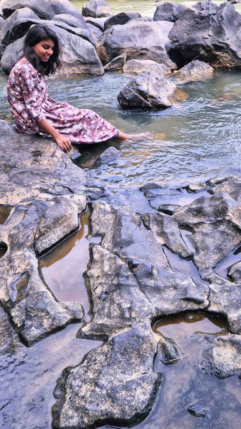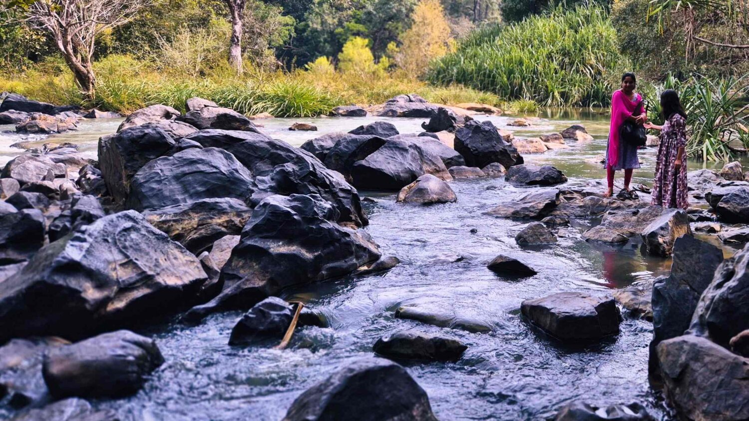 Man macht einen Spaziergang durch eine wunderschöne Waldlandschaft zu einer Stelle an einem Arm des Flusses, wo dieser durch Felsen in seinem Lauf kleine Badebecken und Stromschnellen bildet. Das Wasser ist kalt, die Szenerie malerisch