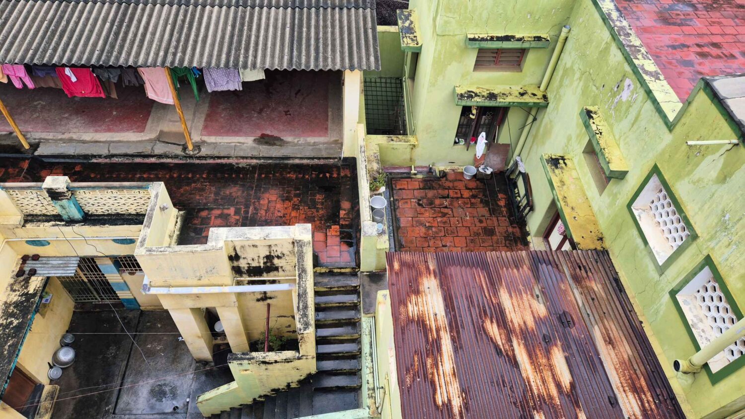 Hier erstmal nur ein Schnappschuss von der Dachterrasse runter zu den Nachbarn