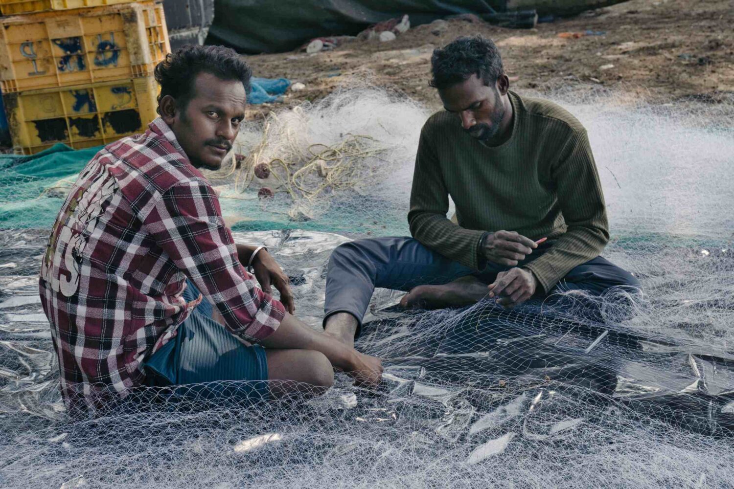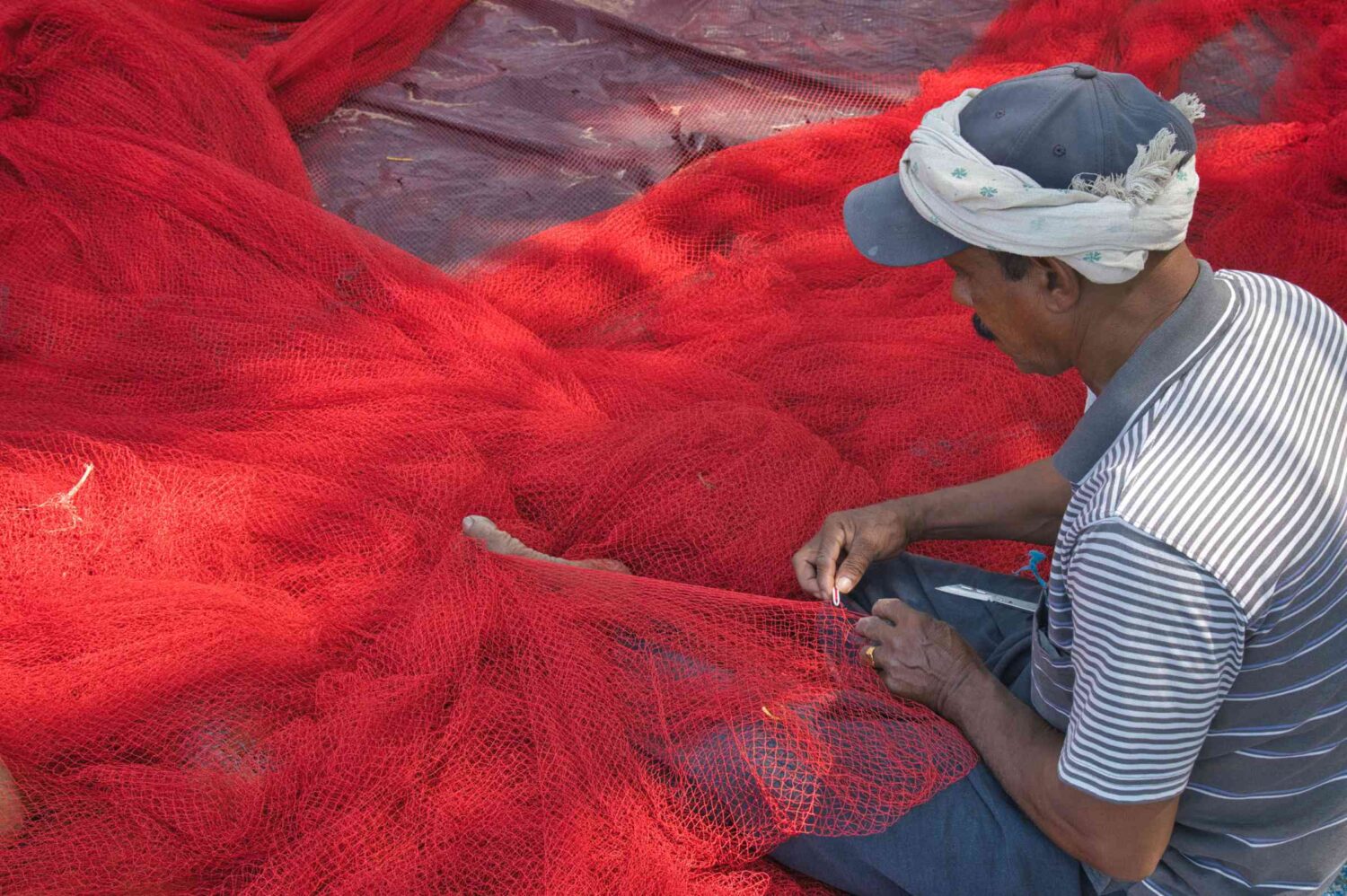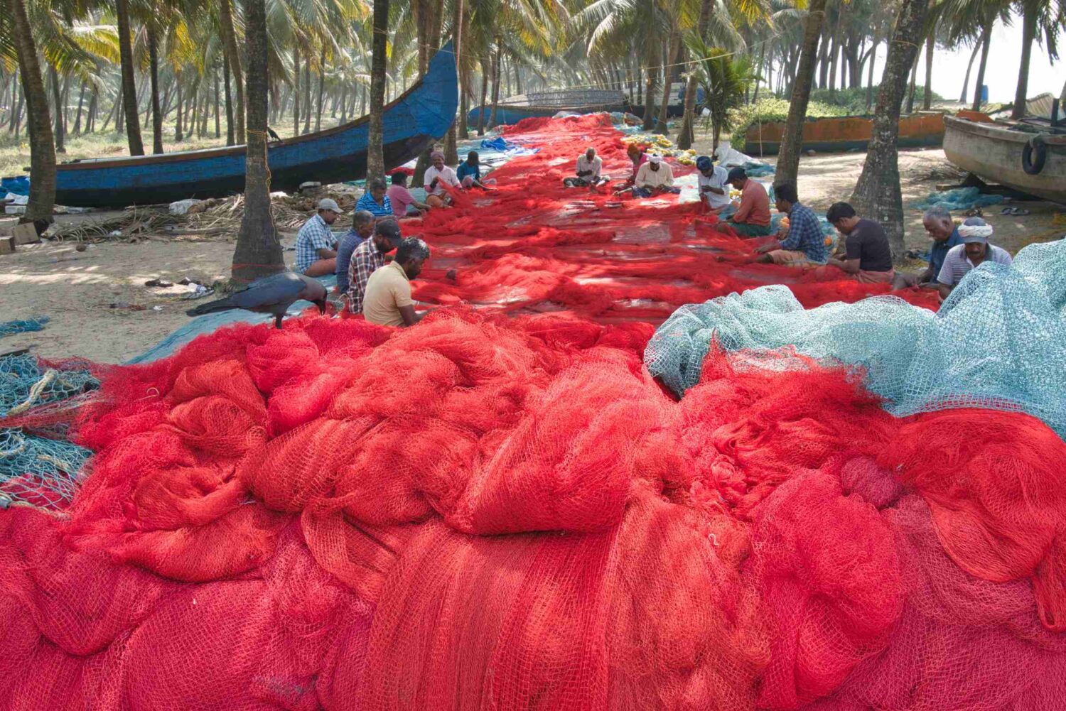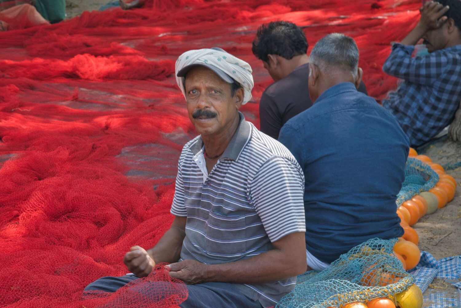 Siebzehn Fischer sitzen zusammen unter Kokospalmen, säubern und reparieren ihre roten Fangnetze, reden und lachen miteinander.