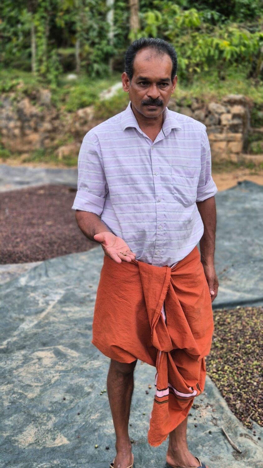 Karthikas Vater, der mir den KaffeeTrocknenPlatz zeigt