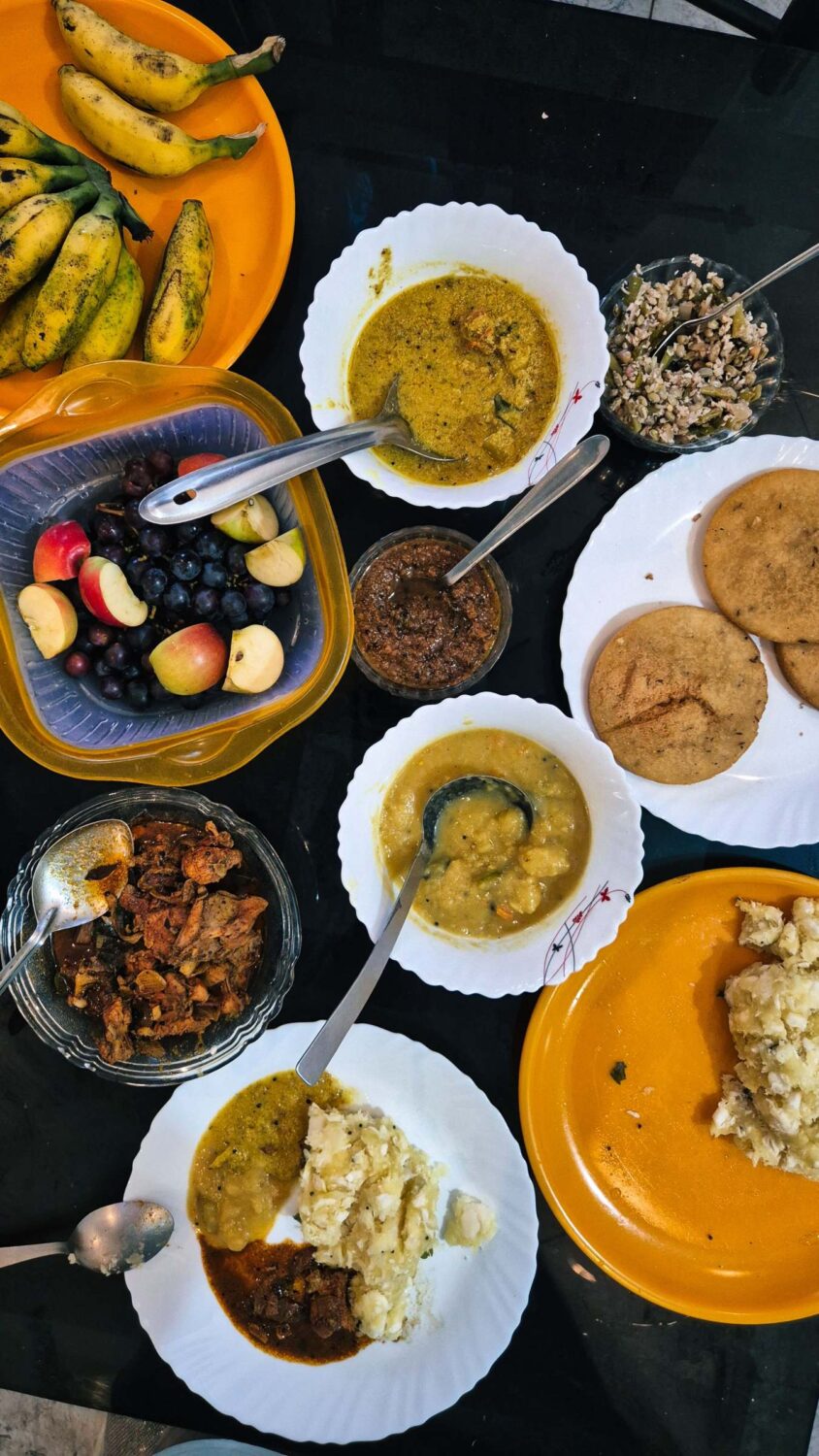 Zwei Stunden verspätet (Stau, weil es wohl einen schweren Verkehrsunfall mit drei Toten gab), nehmen Vater und Tochter mich in Empfang, lassen mich einen Chai trinken und steigen dann mit mir in den nächsten Bus, der uns nach einstündiger Fahrt durch kleine Dörfer und wunderschön grüne Landschaften in der Nähe des Hauses der Eltern ausspuckt. Dort werde ich herzlich von der Mutter, den Großeltern, Tanten, Bruder, Cousins, Cousinen und auch Nachbarn in Empfang genommen. Ich werde bekocht, in der Nachbarschaft herumgeführt – der Deal ist, dass ich hier abends mit der Familie esse, während ich in dem Resort, dass man für mich in zwei Kilometer Entfernung ausgesucht hat, Frühstück bekomme.