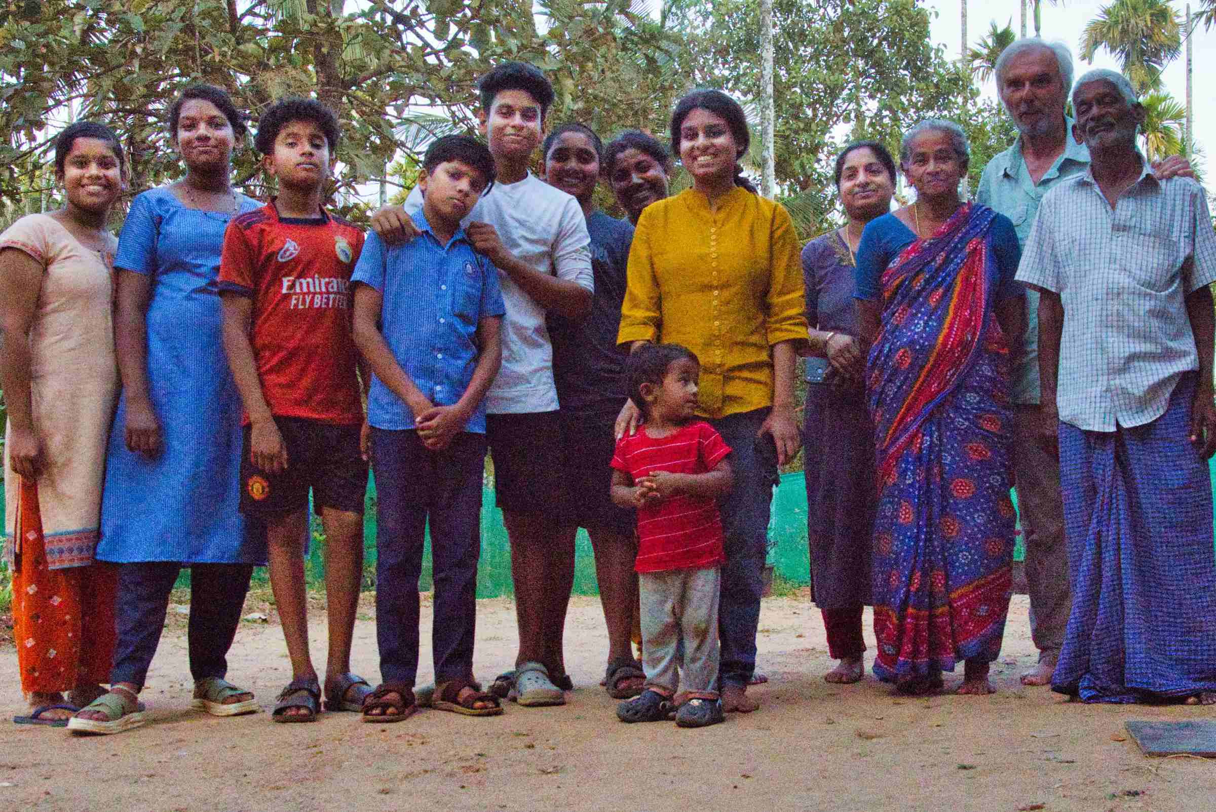 Zwei Stunden verspätet (Stau, weil es wohl einen schweren Verkehrsunfall mit drei Toten gab), nehmen Vater und Tochter mich in Empfang, lassen mich einen Chai trinken und steigen dann mit mir in den nächsten Bus, der uns nach einstündiger Fahrt durch kleine Dörfer und wunderschön grüne Landschaften in der Nähe des Hauses der Eltern ausspuckt. Dort werde ich herzlich von der Mutter, den Großeltern, Tanten, Bruder, Cousins, Cousinen und auch Nachbarn in Empfang genommen. Ich werde bekocht, in der Nachbarschaft herumgeführt – der Deal ist, dass ich hier abends mit der Familie esse, während ich in dem Resort, dass man für mich in zwei Kilometer Entfernung ausgesucht hat, Frühstück bekomme.