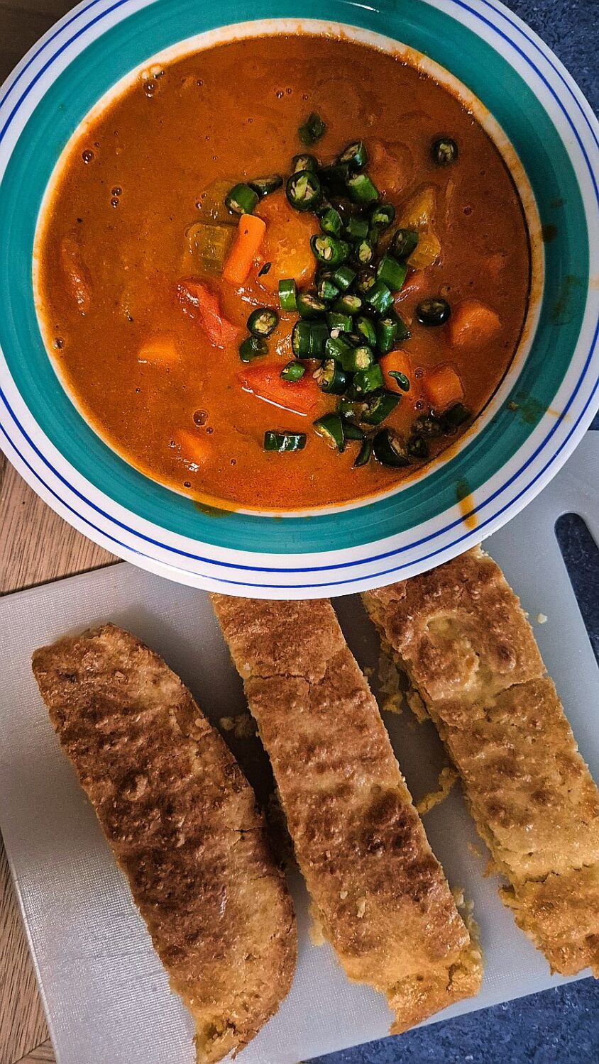 Auch meine aufgetaute scharfe Kichererbsensuppe mit meinem selbst gebackenem Schafskäse-Knoblauch-Brot sorgen für Wärme.